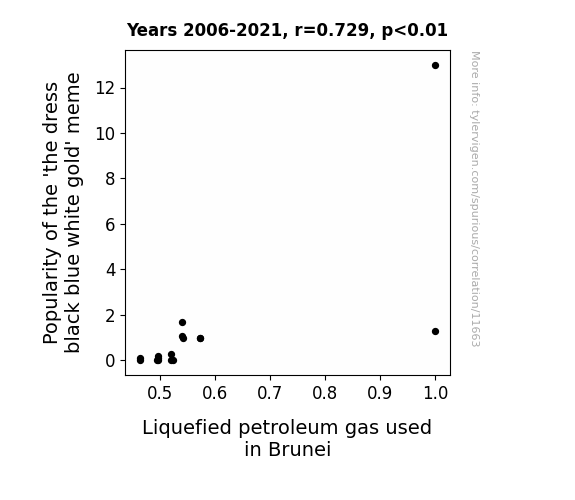 This means 53.2% of the change in the one variable (i.e., Liquefied petroleum gas used in Brunei) is predictable based on the change in the other (i.e., Popularity of the 'the dress black blue white gold' meme) over the 16 years from 2006 through 2021.