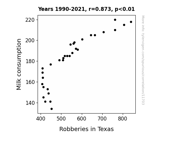 This means 76.1% of the change in the one variable (i.e., Robberies in Texas) is predictable based on the change in the other (i.e., Milk consumption) over the 32 years from 1990 through 2021.