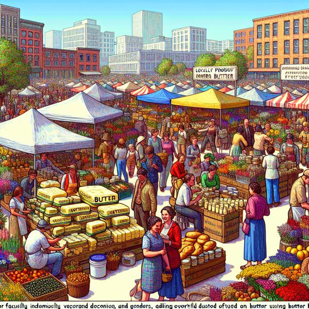 ChatGPT: Create an image of a vibrant farmer's market in the Washington metro area, where sticks of butter from local farms are the center of attention. Show the tables bustling with people eagerly purchasing and using the butter. Surrounding vendors selling flowers, fruits, and vegetables experience a surge in sales as the aroma of freshly baked goods made with butter fills the air. Local cafes and bakeries are packed with customers, and the entire area is buzzing with economic activity as the demand for butter continues to rise. The scene should capture the magical and bustling atmosphere of the farmer's market in an artful and visually enchanting way.