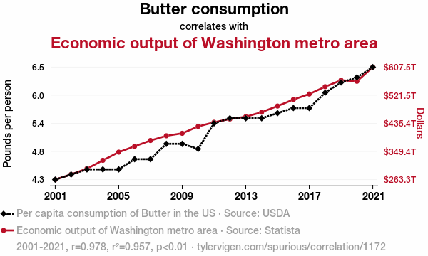 This means 95.7% of the change in the one variable (i.e., Economic output of Washington metro area) is predictable based on the change in the other (i.e., Butter consumption) over the 21 years from 2001 through 2021.