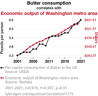 A linear line chart with years as the X-axis and two variables on the Y-axis. The first variable is Butter consumption and the second variable is Economic output of Washington metro area.  The chart goes from 2001 to 2021, and the two variables track closely in value over that time. Small Image