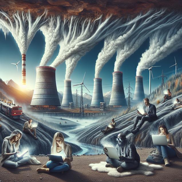 Prompt: Generate an image of a surreal geothermal power plant in Russia, with wisps of steam rising from the earth, giving it an otherworldly appearance. In the background, depict a group of people using sleek Apple products, surrounded by a warm, comforting ambiance. The integration of the natural geothermal energy with the modern usage of Apple products should create an interesting juxtaposition, hinting at the harmony between nature and technology. The scene should have a dreamlike quality, evoking a sense of contentment and satisfaction. The depiction should include only scenes, people, and objects, it should not include text or speech bubbles.