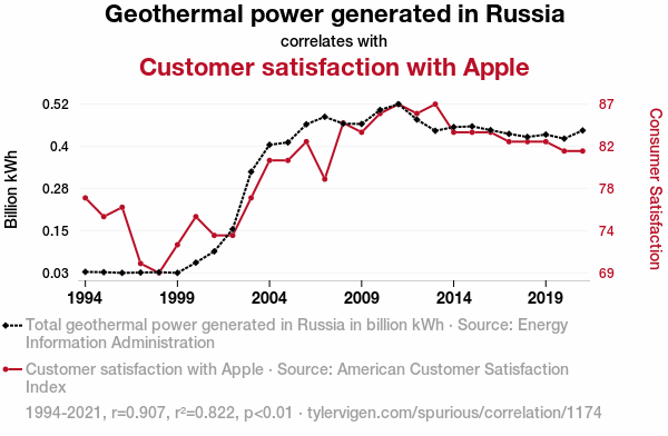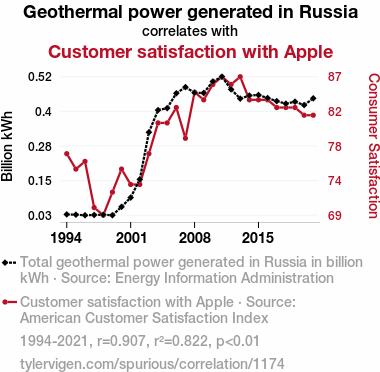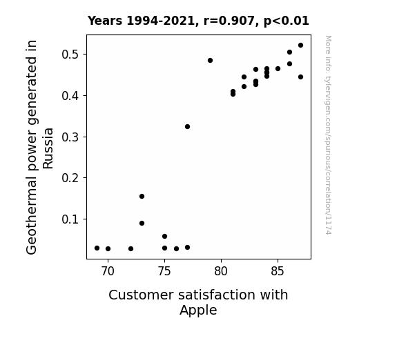 This means 82.2% of the change in the one variable (i.e., Customer satisfaction with Apple) is predictable based on the change in the other (i.e., Geothermal power generated in Russia) over the 28 years from 1994 through 2021.