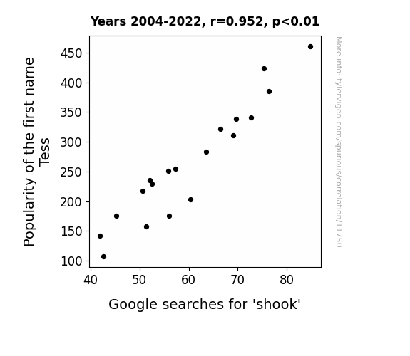 This means 90.7% of the change in the one variable (i.e., Google searches for 'shook') is predictable based on the change in the other (i.e., Popularity of the first name Tess) over the 19 years from 2004 through 2022.