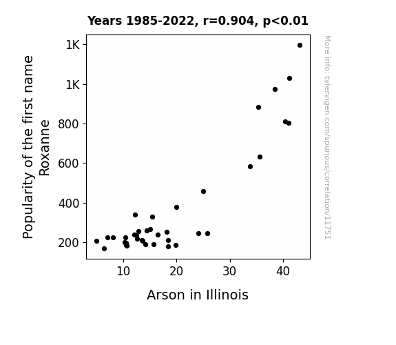 This means 81.8% of the change in the one variable (i.e., Arson in Illinois) is predictable based on the change in the other (i.e., Popularity of the first name Roxanne) over the 38 years from 1985 through 2022.