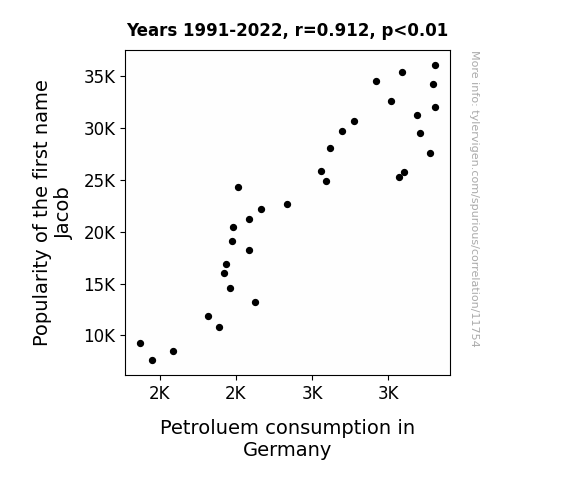 This means 83.1% of the change in the one variable (i.e., Petroluem consumption in Germany) is predictable based on the change in the other (i.e., Popularity of the first name Jacob) over the 32 years from 1991 through 2022.