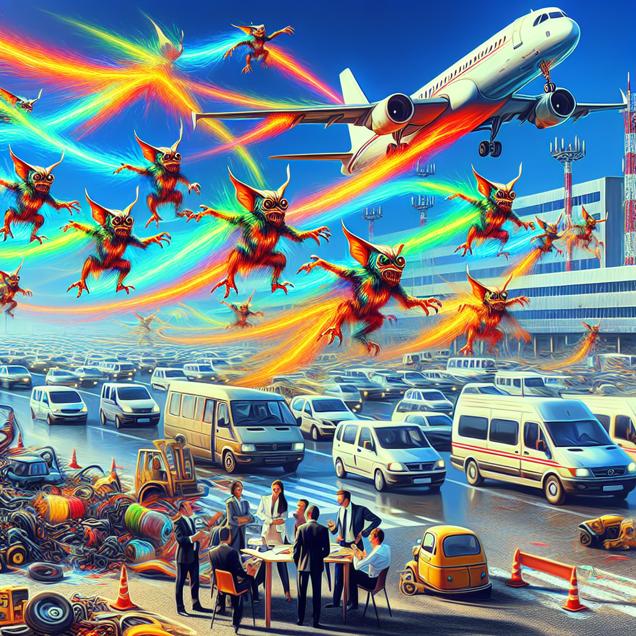 Prompt: Generate an image of a cybernetic artwork that features a bustling airport in Senegal. In the scene, airplanes are captured taking off and landing, leaving vibrant trails of jet fuel in the sky. As the jets soar overhead, whimsical creatures resembling mischievous cybernetic gremlins appear in the air, seemingly formed from the jet fuel. These enchanting creatures joyfully drift down to the ground and stealthily infiltrate car engines, causing chaos and mischief. Concurrently, automotive engineers are showcased scratching their heads and brainstorming ways to combat these troublesome cybernetic gremlins. This imagery embodies the unexpected correlation between increased jet fuel utilization and an escalation in automotive recalls due to engine issues. The representation should be simple and devoid of any text or dialogue. The depiction should include only scenes, people, and objects, it should not include text or speech bubbles.