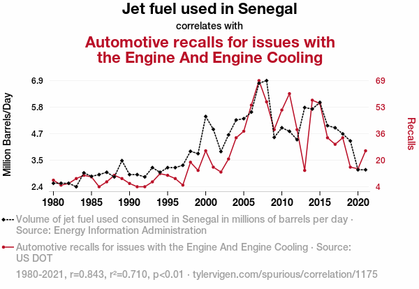 This means 71% of the change in the one variable (i.e., Automotive recalls for issues with the Engine And Engine Cooling) is predictable based on the change in the other (i.e., Jet fuel used in Senegal) over the 42 years from 1980 through 2021.