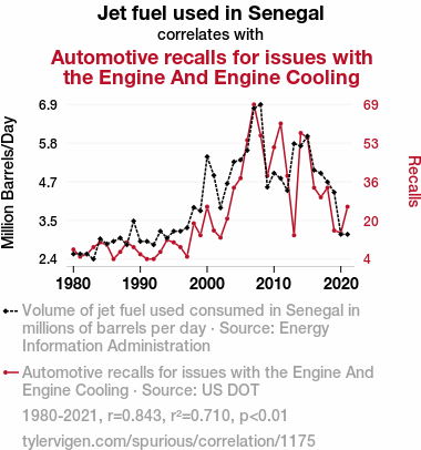 - The spurious research paper: Fuelling the Engine: A Study on the Relationship Between Jet Fuel Usage in Senegal and Automotive Recalls for Engine and Engine Cooling Issues