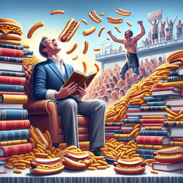 User prompt: Please describe a visual scene that depicts the following situation. Keep the description simple. The increase in New York Times Fiction Best Sellers caused an increase in Hotdogs consumed by Nathan's Hot Dog Eating Competition Champion because reading fiction stimulates the imagination, leading to a heightened sense of adventure and a desire to experience new and exciting things - like eating an excessive amount of hotdogs in a competitive setting.