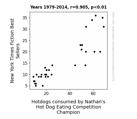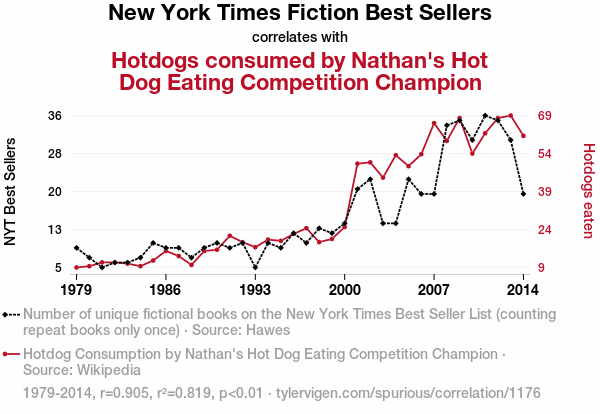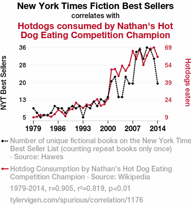 New York Times Fiction Best Sellers, Nathan's Hot Dog Eating Competition, correlation between best sellers and hotdog consumption, statistical significance of literary and culinary link, Hawes data, Wikipedia data, competitive eaters' appetite, impact of fiction on competitive eating, connection between literary tastes and hotdog consumption
