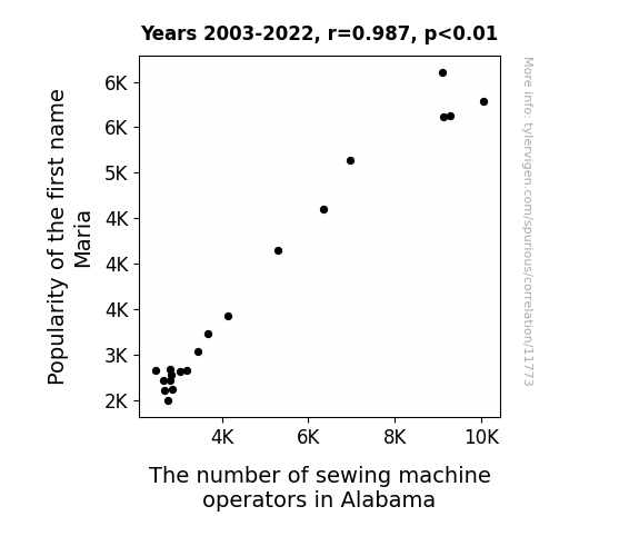 This means 97.5% of the change in the one variable (i.e., The number of sewing machine operators in Alabama) is predictable based on the change in the other (i.e., Popularity of the first name Maria) over the 20 years from 2003 through 2022.