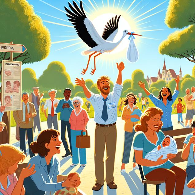 User prompt: Please respond with an image generation prompt that would be likely to create an interesting visual using DALLE-3, using the following style: [ Cute 2D animation ] and depicting this scene: Imagine a bustling park on a sunny day, where many people are chatting and mingling. You notice that each time someone named Reid introduces themselves, a group of people nearby suddenly start beaming with excitement. In the background, you see a stork flying overhead, delivering a bundle of joy to a happy family, symbolizing the surge in the total number of live births in Australia due to this unusual baby-naming Pavlovian response. Keep the visual depiction simple. Do not include any words or speech bubbles.