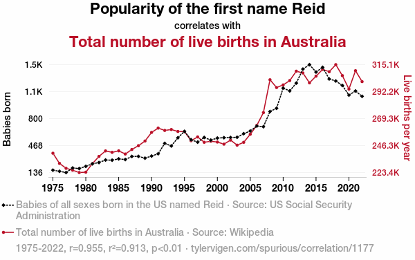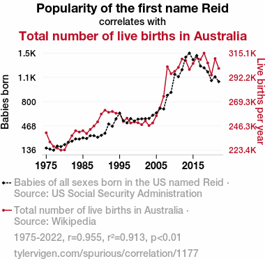 - The spurious research paper: Reid-iculous Popularity: A Statistical Analysis of the Name Reid and Its Influence on Total Births Down Under