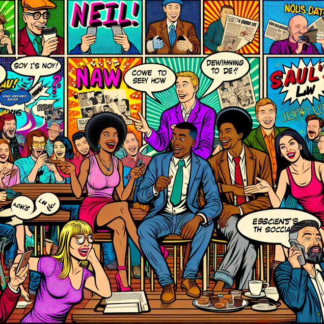ChatGPT: Generate an image of Neil and his friends sitting in a vibrant, retro pop art coffee shop setting. In the foreground, Neil and his friends are portrayed in bold, dynamic colors, engaged in animated conversations, with visible expressions of laughter and delight. Surrounding them, the colorful pop art-style background features the displayed xkcd comics about social media on the wall, capturing the attention of onlookers who are enthusiastically pointing at and sharing the comics on their phones. The atmosphere is full of energy and liveliness, as the coffee shop is abuzz with a bustling crowd discussing and referencing Neil and the clever xkcd comics. The scene also includes a small blackboard in the corner with the hastily written "Neil's Law" note, adding a quirky touch to the overall composition.