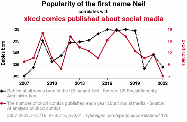 xkcd, social media, Neil, prevalence, first name, US Social Security Administration data, AI analysis, webcomic series, correlation coefficient, 2007-2022, influence, cultural representations, memes