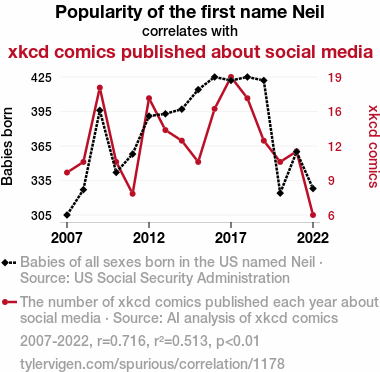 User prompt: Please make up a funny explanation for how increases in Popularity of the first name Neil positively influenced xkcd comics published about social media.