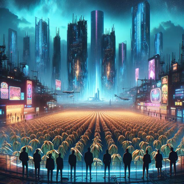 Prompt: Generate an image of a cyberpunk world where a vast field of tobacco plants is withering under neon-lit skies, symbolizing the decrease in US tobacco production. Fewer plants stand in the field, their leaves wilted and fading under the city's glow. In the background, a group of figures can be seen, smoking fewer cigarettes than before, shrouded in the hazy glimmer of the city. Nearby, a futuristic casino stands, its slot machines flashing in the darkness, but with fewer people taking smoke breaks, reflecting the declining demand. The scene presents a juxtaposition of nature's decline and the changing habits of a society intertwined with technology and industry. The depiction should include only scenes, people, and objects, it should not include text or speech bubbles.