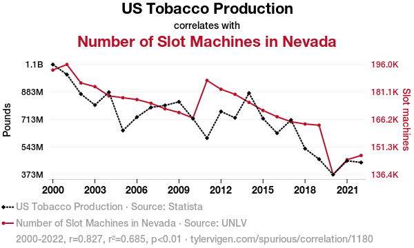 - The spurious research paper: Smoke and Mirrors: The Relationship Between US Tobacco Production and Number of Slot Machines in Nevada