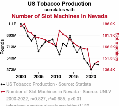 US tobacco production, Nevada slot machines, tobacco industry correlations, agricultural production gaming industry, correlation coefficient, Statista data, University of Nevada Las Vegas study, tobacco and gambling connection, tobacco production statistical odyssey