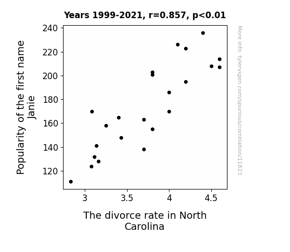 This means 73.5% of the change in the one variable (i.e., The divorce rate in North Carolina) is predictable based on the change in the other (i.e., Popularity of the first name Janie) over the 23 years from 1999 through 2021.