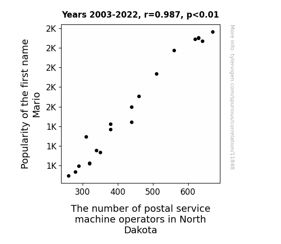 This means 97.4% of the change in the one variable (i.e., The number of postal service machine operators in North Dakota) is predictable based on the change in the other (i.e., Popularity of the first name Mario) over the 20 years from 2003 through 2022.