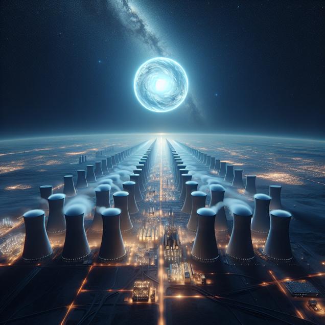 ChatGPT: Create an image of a surreal night sky with Uranus shining in the distance, illuminating rows of futuristic nuclear power plants on the Earth's surface. The power plants are sleek and advanced, stretching into the horizon under the celestial influence of Uranus. The scene should capture the sense of expansion and innovation in harnessing nuclear energy, symbolizing the increase in global operating nuclear power plants due to the growing distance between Uranus and the Sun.