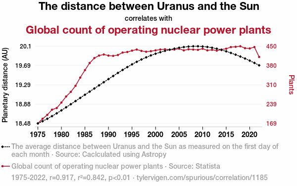 A linear line chart with years as the X-axis and two variables on the Y-axis. The first variable is The distance between Uranus and the Sun and the second variable is Global count of operating nuclear power plants.  The chart goes from 1975 to 2022, and the two variables track closely in value over that time. Small Image