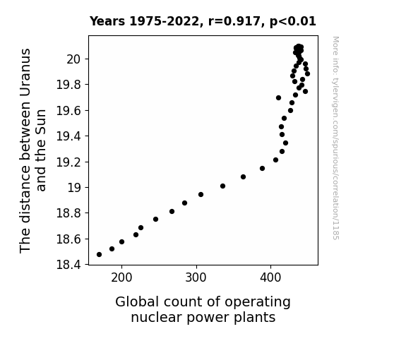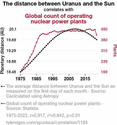 This means 84.2% of the change in the one variable (i.e., Global count of operating nuclear power plants) is predictable based on the change in the other (i.e., The distance between Uranus and the Sun) over the 48 years from 1975 through 2022.