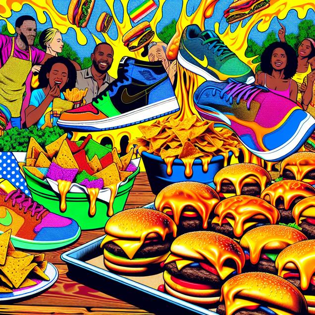 Prompt: Generate a pop art style image of a vibrant outdoor grill scene. In the foreground, showcase sizzling burgers with melted American cheese and loaded nachos topped with gooey cheese on an adjacent table. Happy customers are seen enjoying these cheesy delights, feeling "extra cheesy" as they take bites. Next to the food, display vibrant Puma sneakers catching people's attention. Show customers feeling "pumped" up by the combination of cheesy goodness and the appealing sneakers, leading them to make the decision to pounce on the latest footwear styles. Emphasize the connection between the increase in American cheese consumption and the rise in global Puma sales through vivid and energetic colors and style reminiscent of pop art. The depiction should include only scenes, people, and objects, it should not include text or speech bubbles.