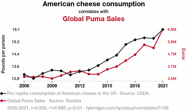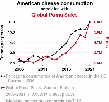 - The spurious research paper: Say Cheese: Unveiling the Cheddar Connection Between American Cheese Consumption and Global Puma Sales