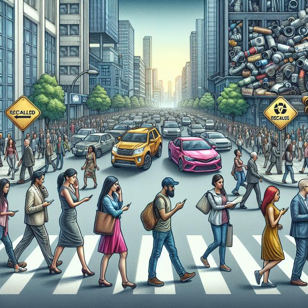 ChatGPT: Generate an image of a bustling city street, with people walking down the sidewalks, their attention focused on the road ahead. In the background, depict a car manufacturing plant with a smaller pile of car parts labeled "recalled" to symbolize a decrease in automotive recalls due to visibility issues. Show fewer cars being affected as drivers pay more attention to the road. Additionally, illustrate a group of people looking at their smartphones or engaging in conversations, symbolizing the fading curiosity about the sky's color. Capture the contrast between the busy street and the dwindling interest in looking up to the sky. The overall visual should convey the shift in attention and the resulting decrease in automotive recalls.