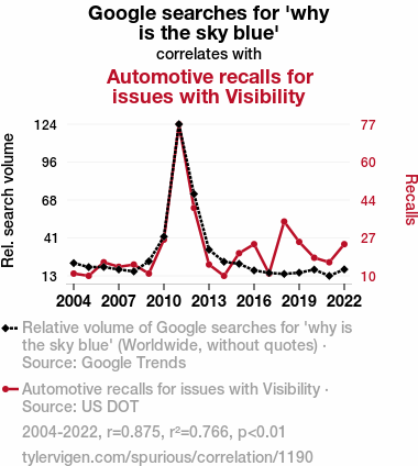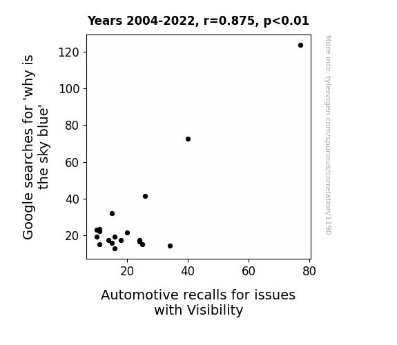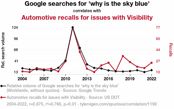 This means 76.6% of the change in the one variable (i.e., Automotive recalls for issues with Visibility) is predictable based on the change in the other (i.e., Google searches for 'why is the sky blue') over the 19 years from 2004 through 2022.