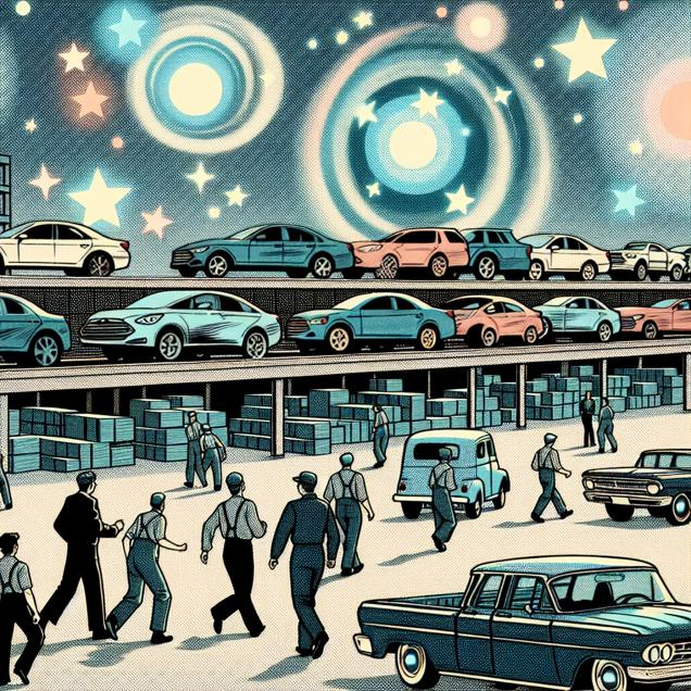 Prompt: Generate a comic-book-style illustration with muted color and a 1960s dotted halftone pattern depicting a bustling parking lot filled with Nissan cars. Each car has a celestial-themed name such as "Starry Night" for the Altima, "Sunrise" for the Rogue, and "Twilight" for the Maxima. The scene shows Nissan employees hurriedly managing a surge in recall demand, amidst the sky-blue colored vehicles. The sky overhead adds to the cosmic chaos, capturing the sense of urgency and high expectations. The depiction should include only scenes, people, and objects, it should not include text or speech bubbles.