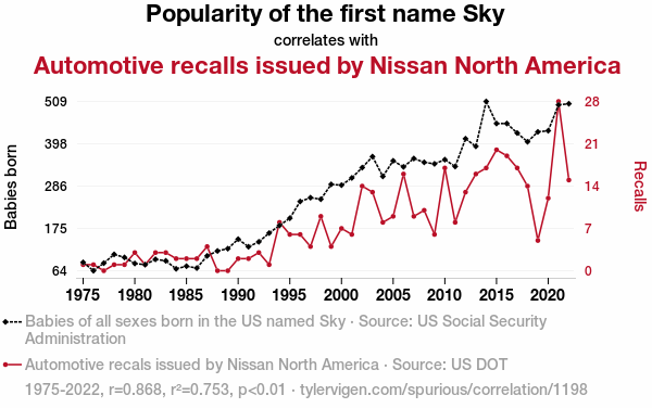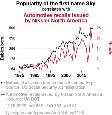 - The spurious research paper: Recalling Sky: Correlating the Popularity of the Name Sky with Nissan North America Automotive Recalls
