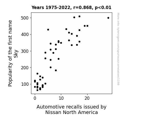 User prompt: Please provide potential search keywords for a paper titled Recalling Sky: Correlating the Popularity of the Name Sky with Nissan North America Automotive Recalls with an abstract of In this research paper, we investigate the unlikely relationship between the popularity of the first name "Sky" and the number of automotive recalls issued by Nissan North America. Combining data from the US Social Security Administration and the US Department of Transportation, we uncovered a surprise correlation that will drive you to the edge of your seat! Our findings reveal a strong positive correlation, with a coefficient of 0.8678074 and p < 0.01, between the increasing popularity of the name "Sky" and the number of automotive recalls by Nissan North America from 1975 to 2022. We delve into the possible mechanisms and societal influences behind this astonishing correlation, providing a whimsical twist to the world of statistical correlations. Join us on this journey as we take the road less traveled to uncover the curious connection between "Sky" and Nissan's automotive recalls.