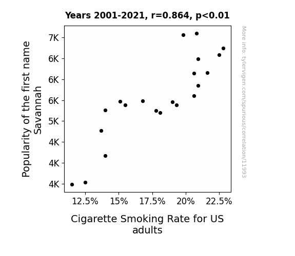 This means 74.6% of the change in the one variable (i.e., Cigarette Smoking Rate for US adults) is predictable based on the change in the other (i.e., Popularity of the first name Savannah) over the 21 years from 2001 through 2021.