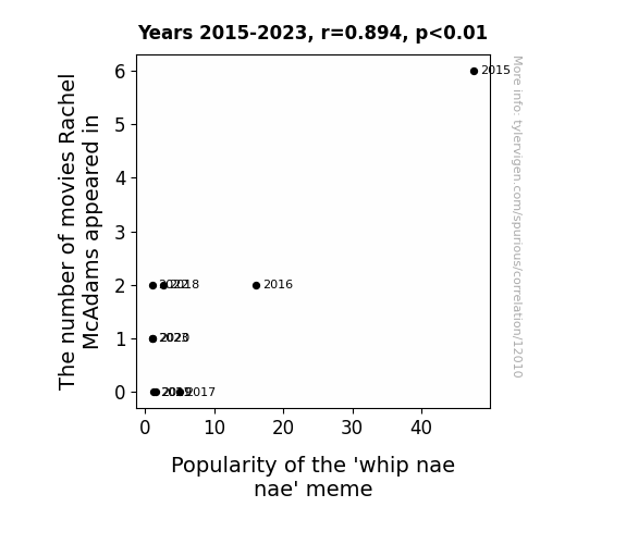 This means 79.9% of the change in the one variable (i.e., Popularity of the 'whip nae nae' meme) is predictable based on the change in the other (i.e., The number of movies Rachel McAdams appeared in) over the 9 years from 2015 through 2023.