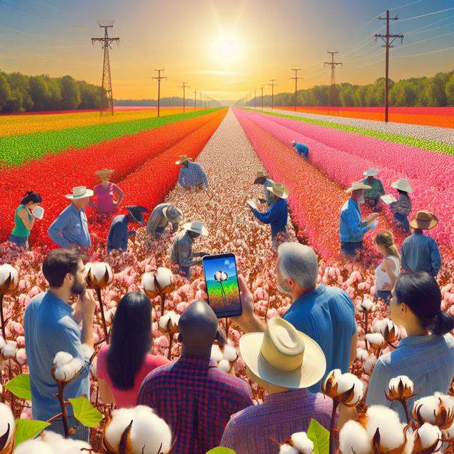 ChatGPT: Generate an image of a cyber-folk scene set in a vibrant cotton field in Arkansas. The cotton plants, genetically modified, gleam in the sunlight as the farmers watch a YouTube video on their smartphone. The picturesque scene is harmoniously synchronized, with the cotton plants swaying gently in the breeze.