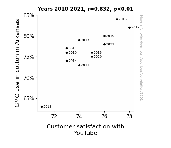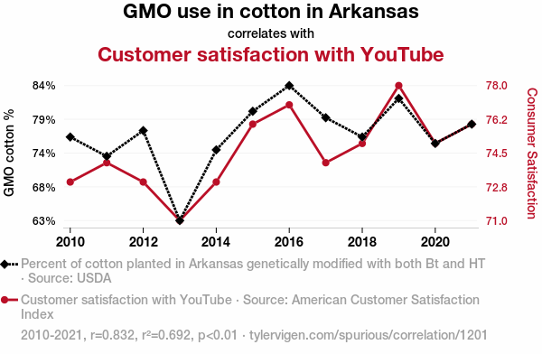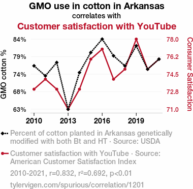 This means 69.2% of the change in the one variable (i.e., Customer satisfaction with YouTube) is predictable based on the change in the other (i.e., GMO use in cotton in Arkansas) over the 12 years from 2010 through 2021.