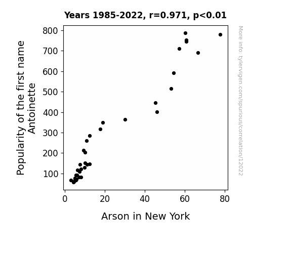 This means 94.4% of the change in the one variable (i.e., Arson in New York) is predictable based on the change in the other (i.e., Popularity of the first name Antoinette) over the 38 years from 1985 through 2022.