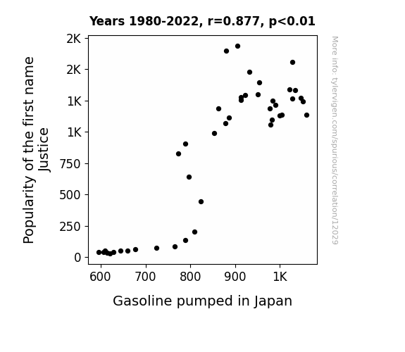 This means 77% of the change in the one variable (i.e., Gasoline pumped in Japan) is predictable based on the change in the other (i.e., Popularity of the first name Justice) over the 43 years from 1980 through 2022.