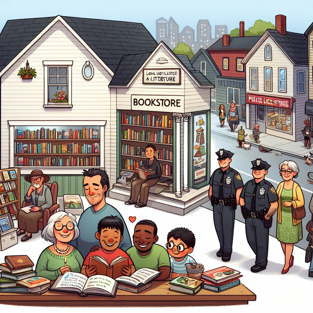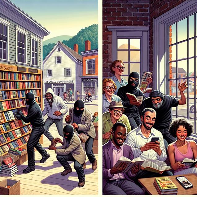 Prompt: Generate an image of a cozy, quaint Vermont town where a unique crime is unfolding in a bookstore. Inside the store, a group of robbers are seen frantically grabbing classic literature off the shelves, shouting puns related to the books they're grabbing. Meanwhile, a small cluster of people are gathered around a smartphone, laughing at xkcd webcomics about literature. The scene depicts an unexpected intersection of book thievery and witty humor, creating a visually intriguing and humorous scenario. The depiction should include only scenes, people, and objects, it should not include text or speech bubbles.