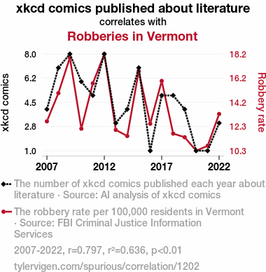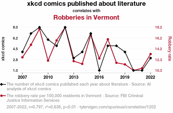 User prompt: Please make up a funny explanation for how increases in xkcd comics published about literature positively influenced Robberies in Vermont.\Make it sound serious until the end.