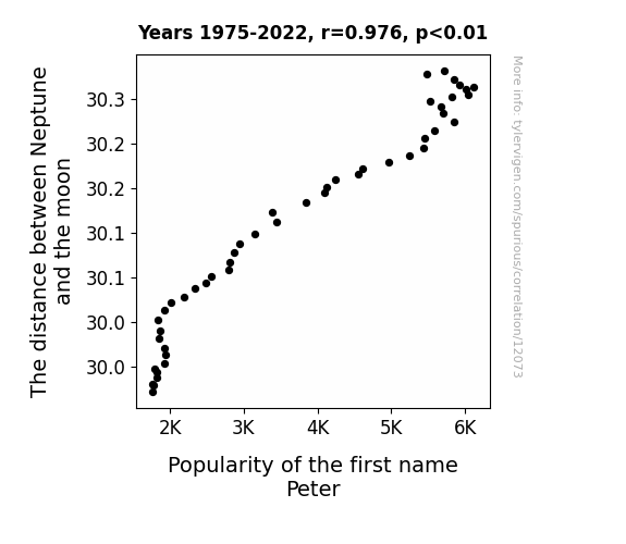 This means 95.3% of the change in the one variable (i.e., Popularity of the first name Peter) is predictable based on the change in the other (i.e., The distance between Neptune and the moon) over the 48 years from 1975 through 2022.