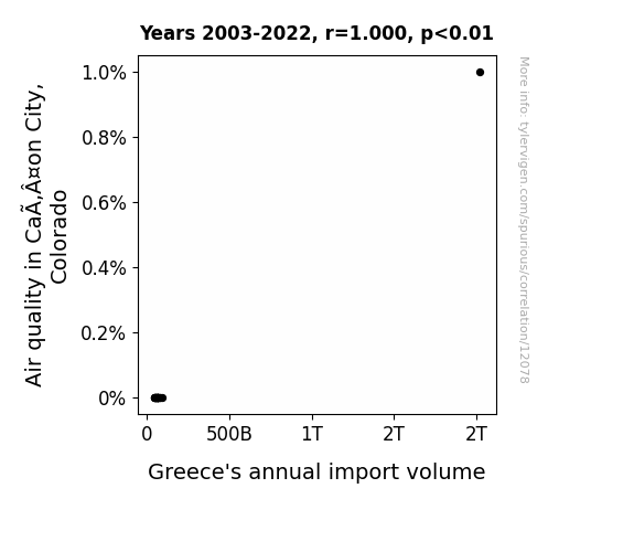 This means 99.9% of the change in the one variable (i.e., Greece's annual import volume) is predictable based on the change in the other (i.e., Air quality in Ca¤on City, Colorado) over the 20 years from 2003 through 2022.