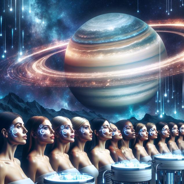 ChatGPT: Generate an image of a futuristic scene where in a tranquil night sky, Saturn and Uranus drift farther apart. The magnificent rings of Saturn glisten and expand, as if stretching outwards, creating a gentle tug in the space around them. On Earth, women are visiting a clinic, with a subtle yet noticeable increase in the number of Botox injections being administered. Their relaxed expressions after the procedure suggest a newfound sense of youthful confidence. The image should capture the serene cosmic dance of the planets and the subtle transformation of human faces, all in a futuristic and visually compelling style.