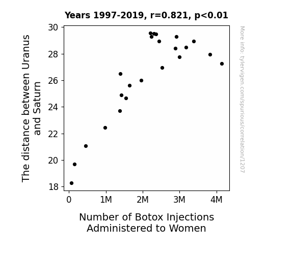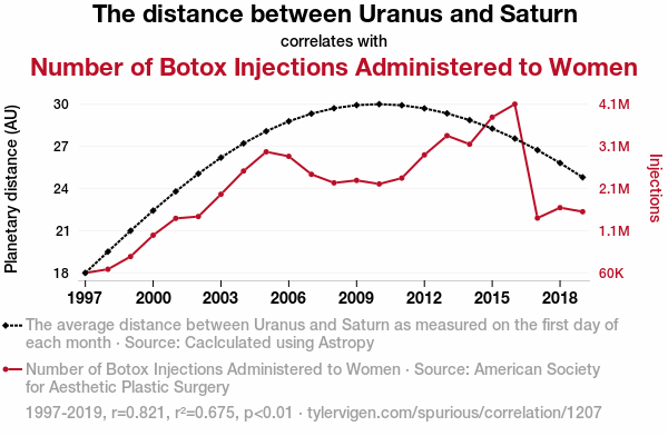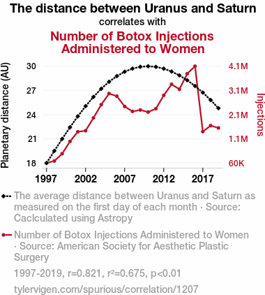 This means 67.5% of the change in the one variable (i.e., Number of Botox Injections Administered to Women) is predictable based on the change in the other (i.e., The distance between Uranus and Saturn) over the 23 years from 1997 through 2019.