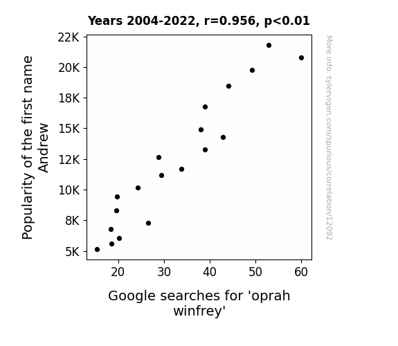 This means 91.4% of the change in the one variable (i.e., Google searches for 'oprah winfrey') is predictable based on the change in the other (i.e., Popularity of the first name Andrew) over the 19 years from 2004 through 2022.
