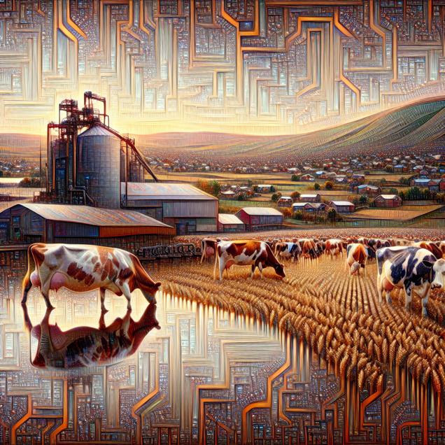 User prompt: Please respond with an image generation prompt that would be likely to create an interesting visual using DALLE-3, using the following style: [ Data cyber art ] and depicting this scene: Imagine a bustling dairy farm with rows of cows munching on their feed. On one side, you see a smaller pile of wheat, as the farm has reduced the amount of wheat used as animal feed. The cows look visibly unhappy, mooing and pacing around restlessly. In the background, you see a dairy processing plant with workers looking concerned as they struggle to keep up with the reduced milk production. Meanwhile, in a nearby town, customers at a Dell store are frowning and expressing dissatisfaction as they struggle to find lactose-containing products, such as milk and cheese, leading to a decline in customer satisfaction. Keep the visual depiction simple. Do not include any words or speech bubbles.